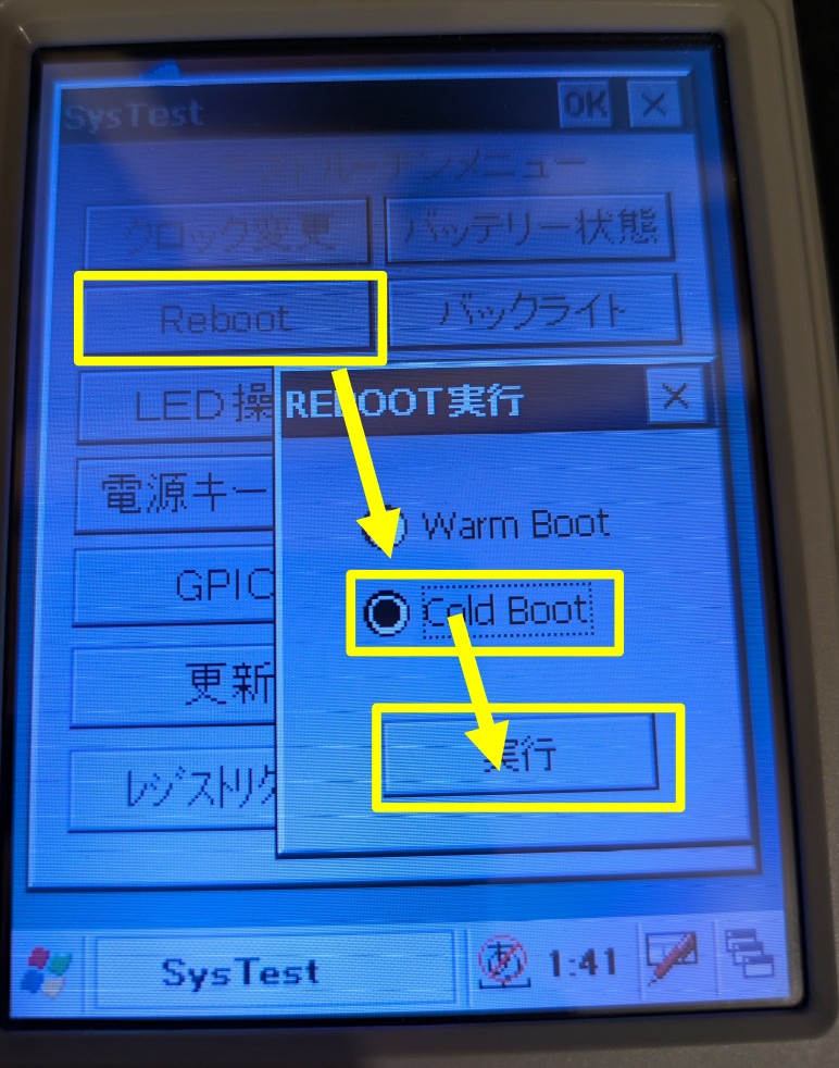 まずはCold Bootさせます(本体背面のリセットボタンはWarm Bootに相当するみたいで、SYSTEM MENUが開きません):