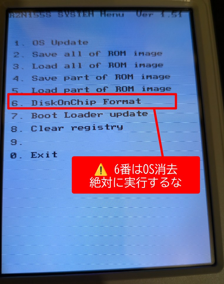 🚫SYSTEM MENUで「6. DiskOnChip Format」オプションは絶対に選択してはいけません。Windows CEそのものが消滅して起動できなくなってしまいます(ROMイメージを入手できないと文鎮化する)。