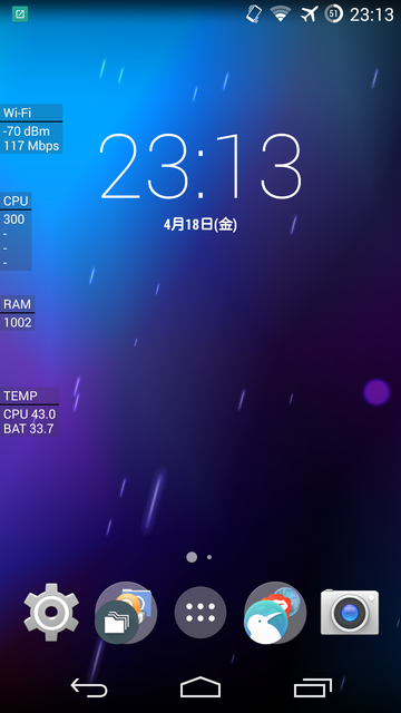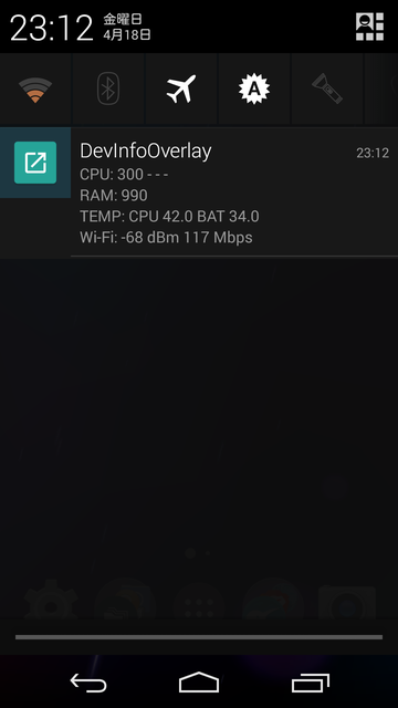 CPU速度、メモリ使用量、温度、Wi-Fiなどの情報を画面上にオーバーレイ表示するアプリです。通知欄に表示させることも可能です。