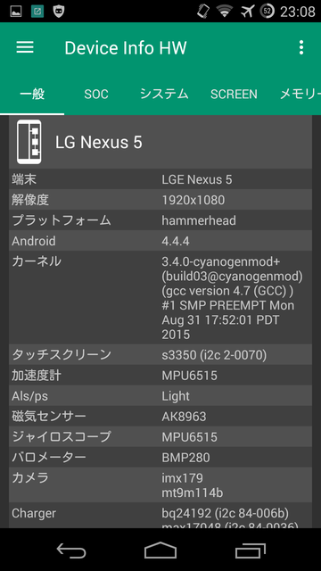 SoCやメモリ、センサーなどのハードウェアの仕様を表示するアプリです。