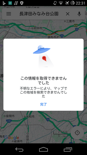 2025年4月現在でも地図、航空写真、地形、ストリートビュー、渋滞情報、経路検索機能が正常に動作しています。しかし、画面上部の検索バーは正常に機能していないようで、「この情報を取得できませんでした。」というエラーが表示されます。